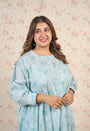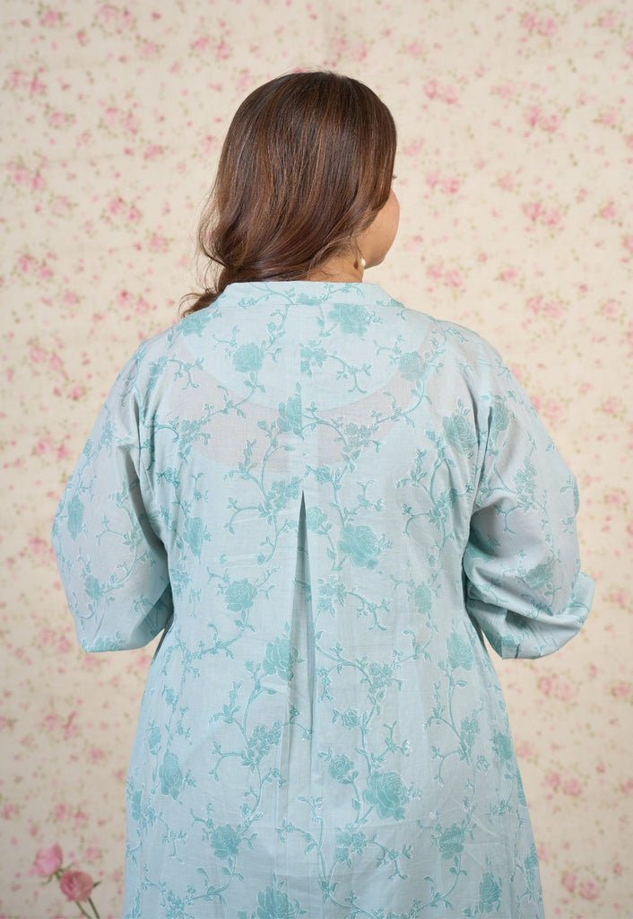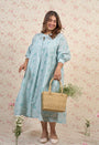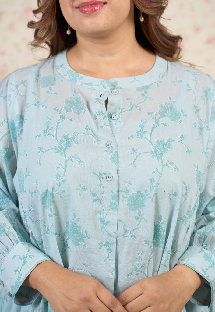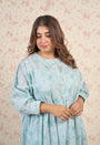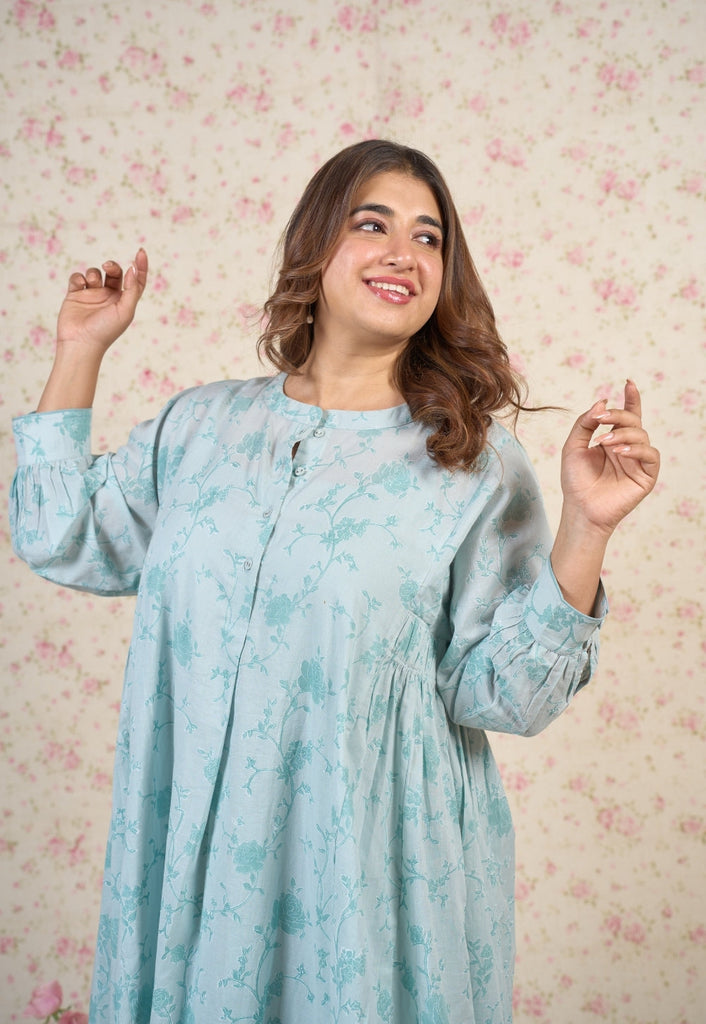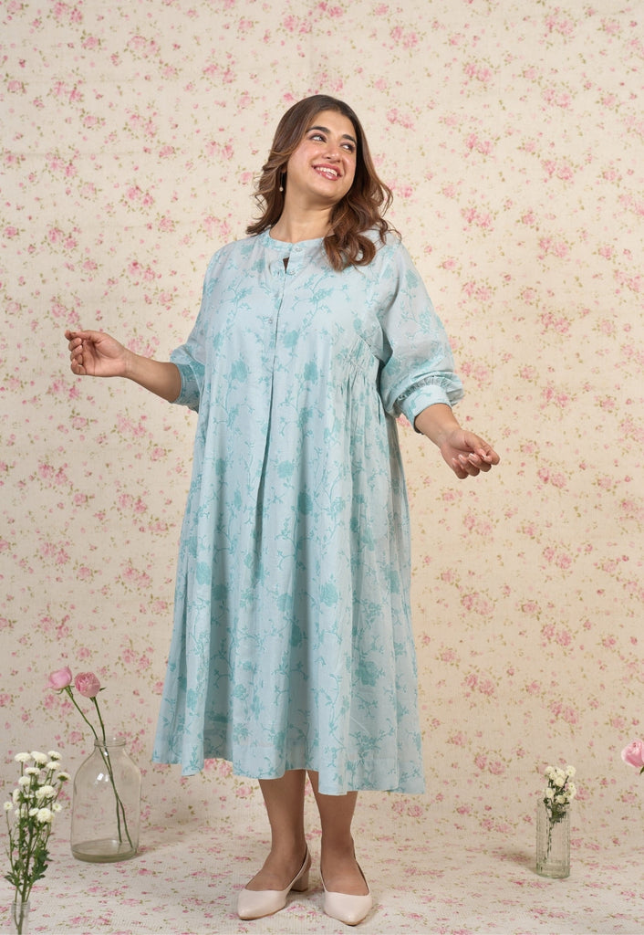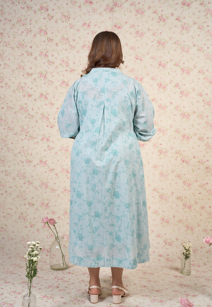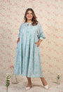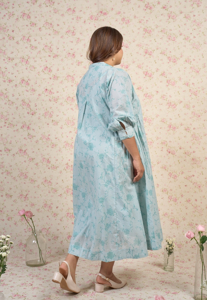 Light Blue Sanganeri Handblock Printed Mul Cotton A Line Dress.