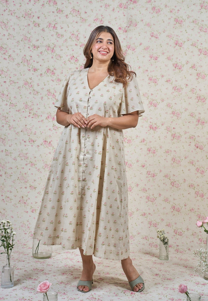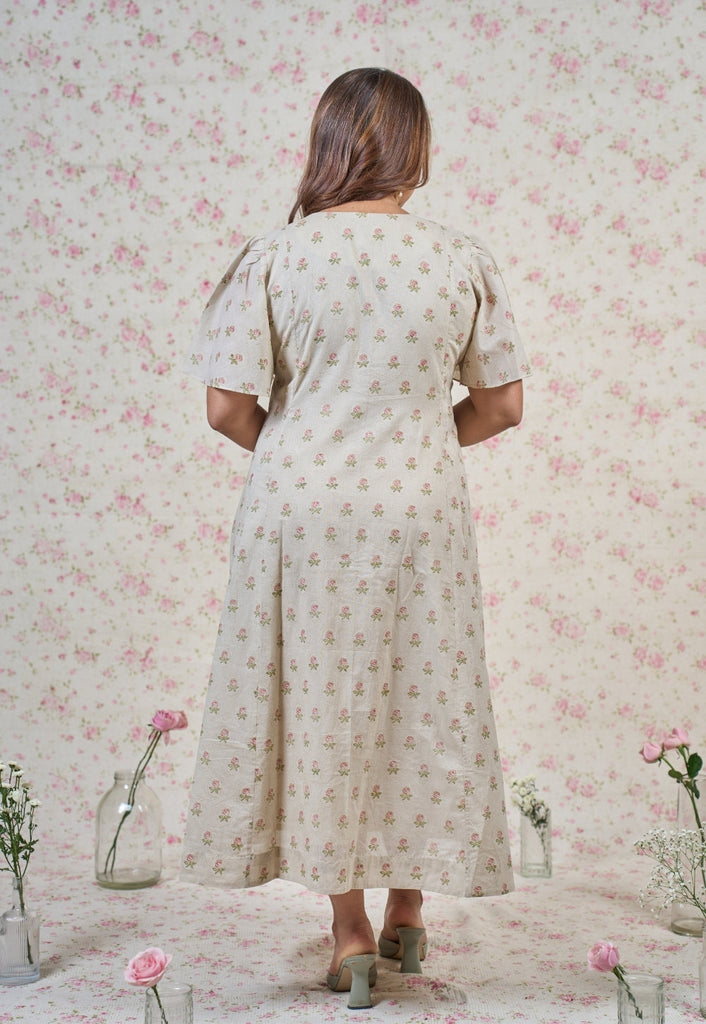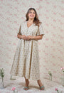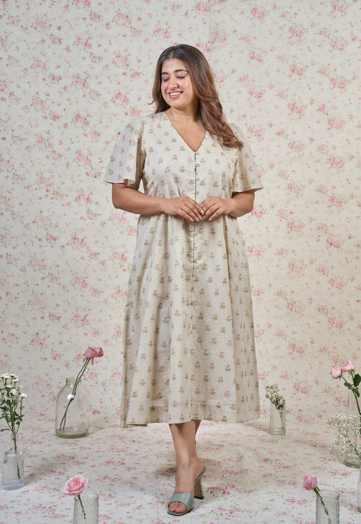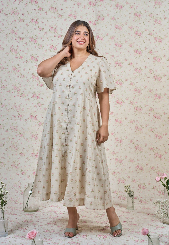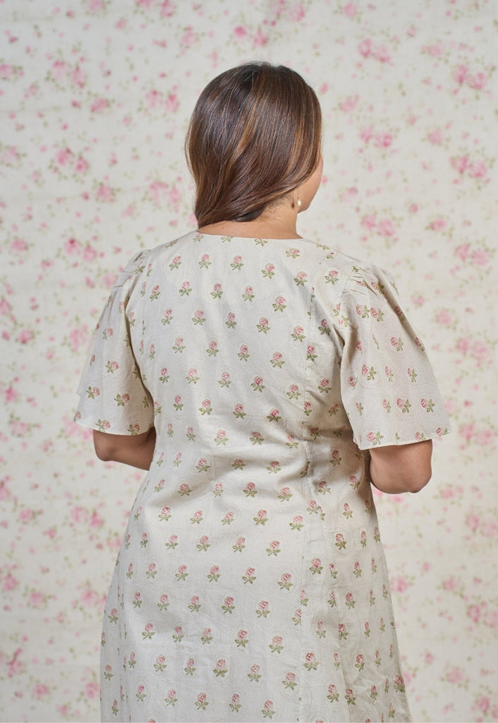 Light Grey Butti Sanganeri Handblock Printed Mul Cotton A Line Dress.