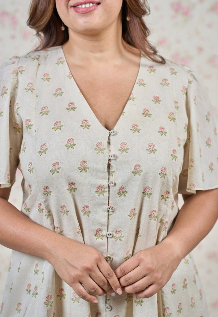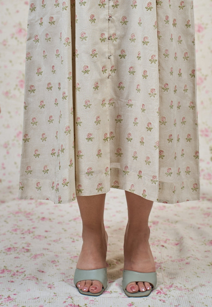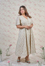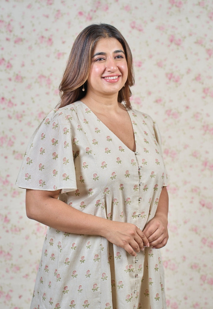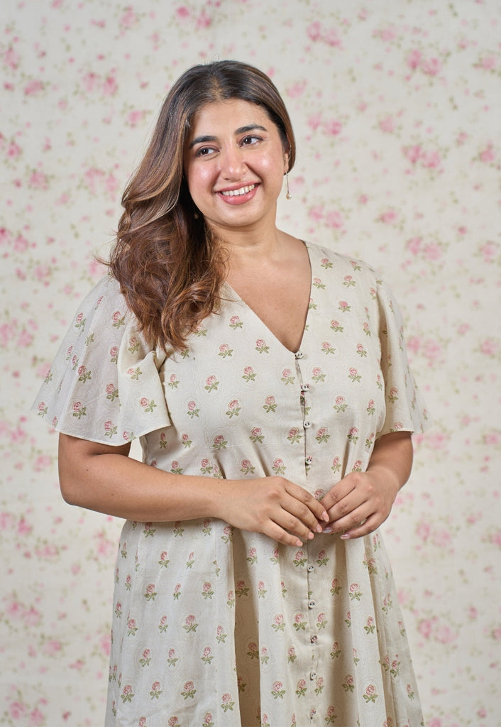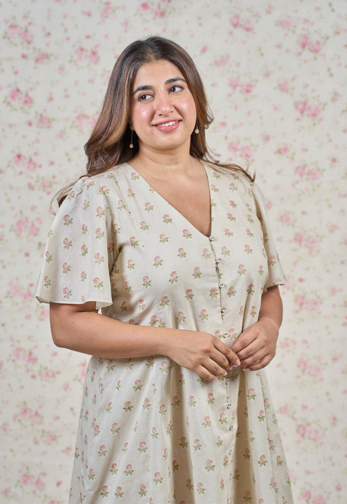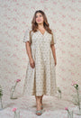 Light Grey Butti Sanganeri Handblock Printed Mul Cotton A Line Dress.