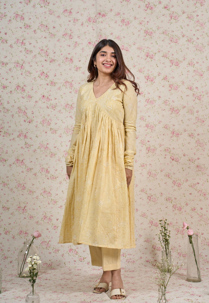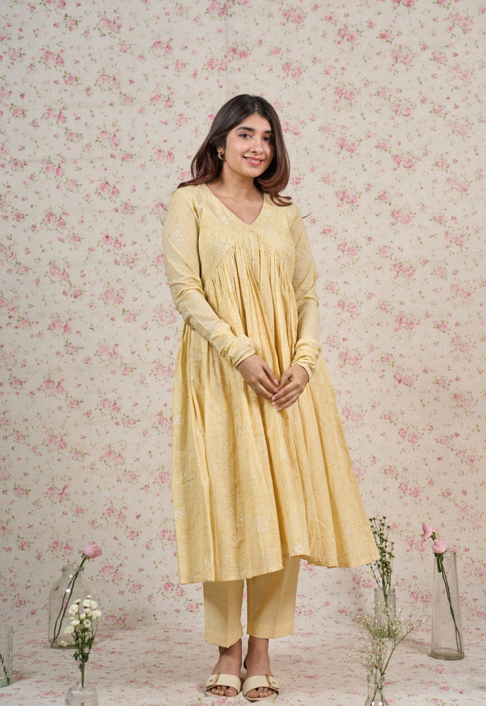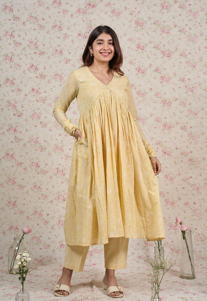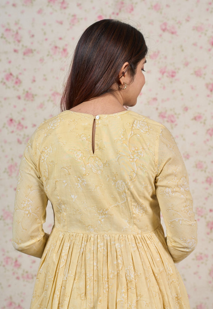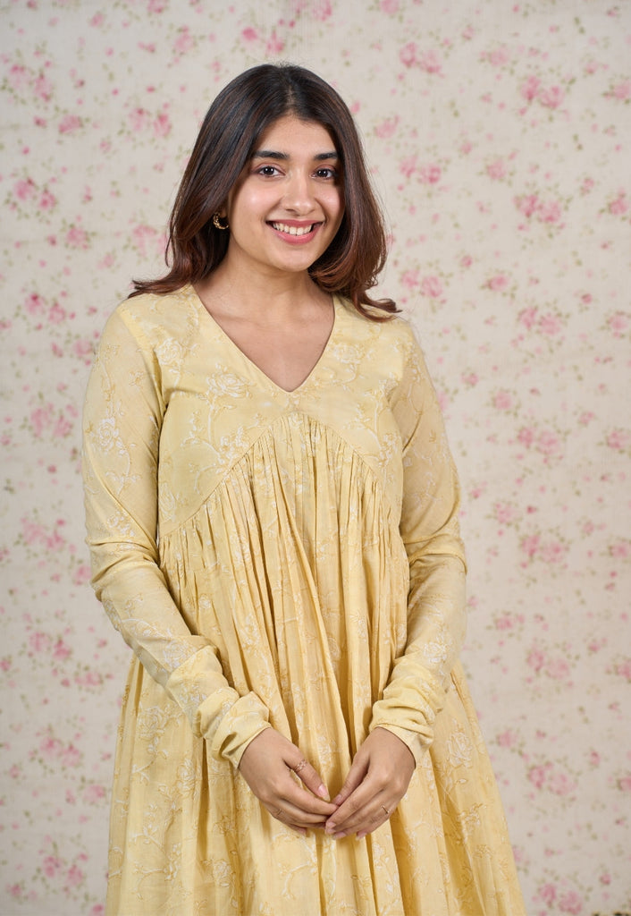 Light Yellow Sanganeri Handblock Printed Mul Cotton A Line Kurta.
