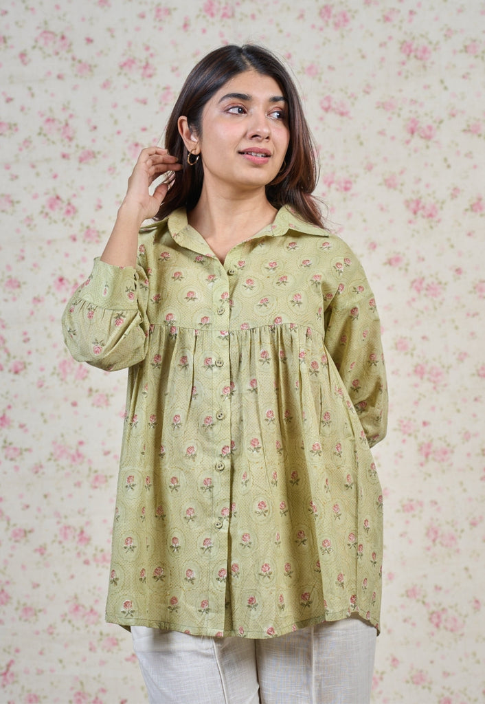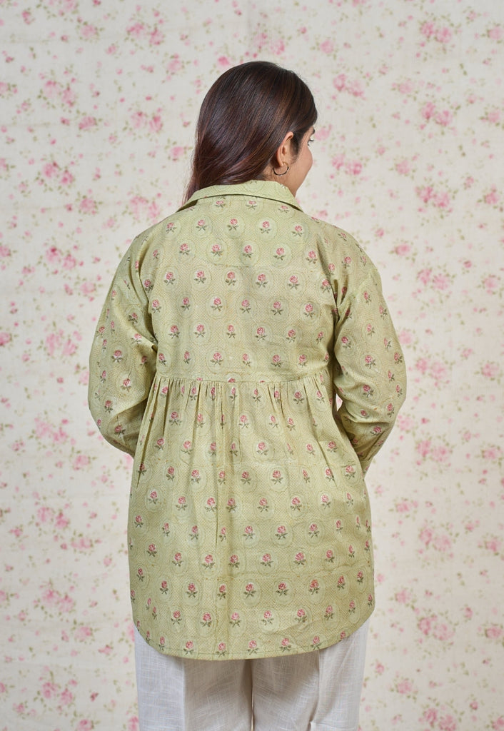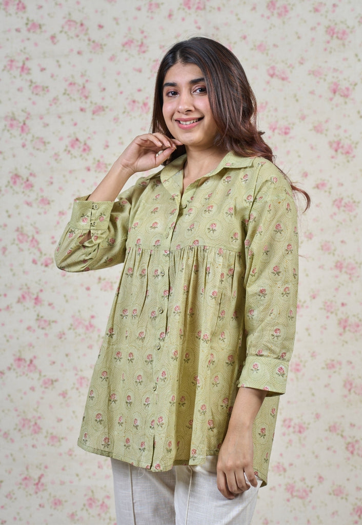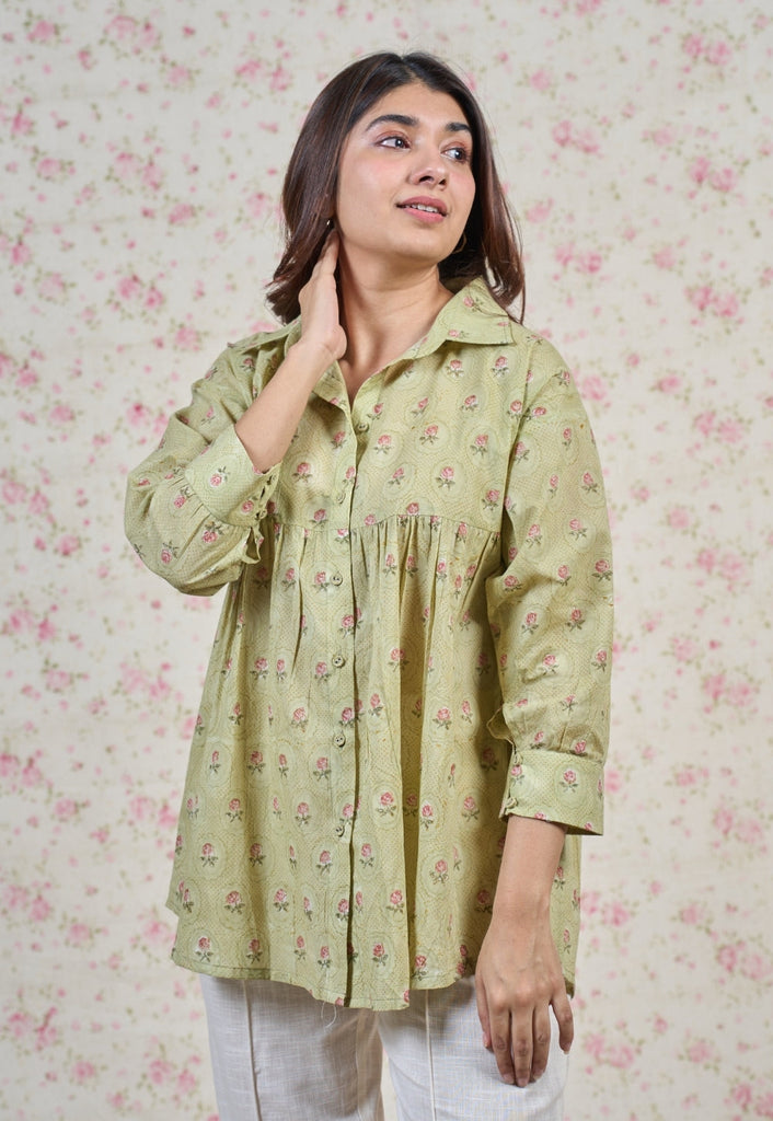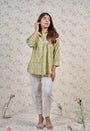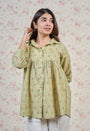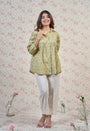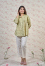 Light Green Sanganeri Handblock Printed Mul Cotton Straight Short Top.