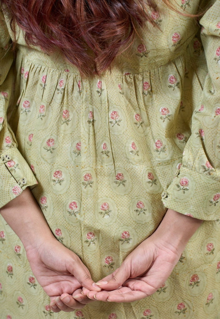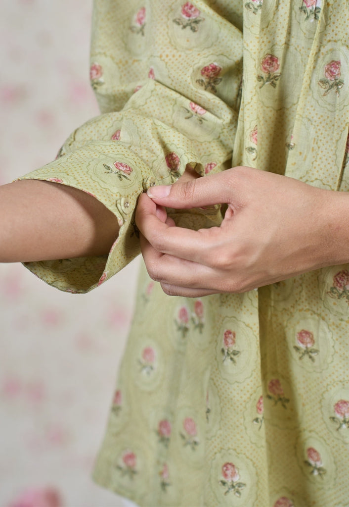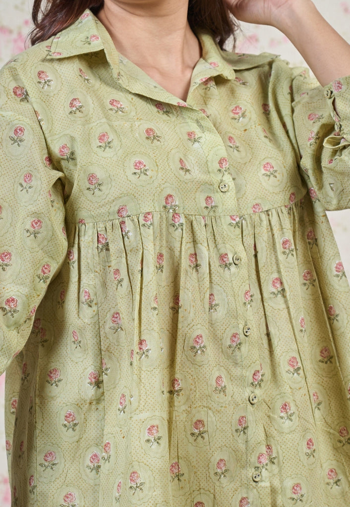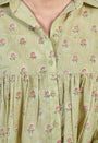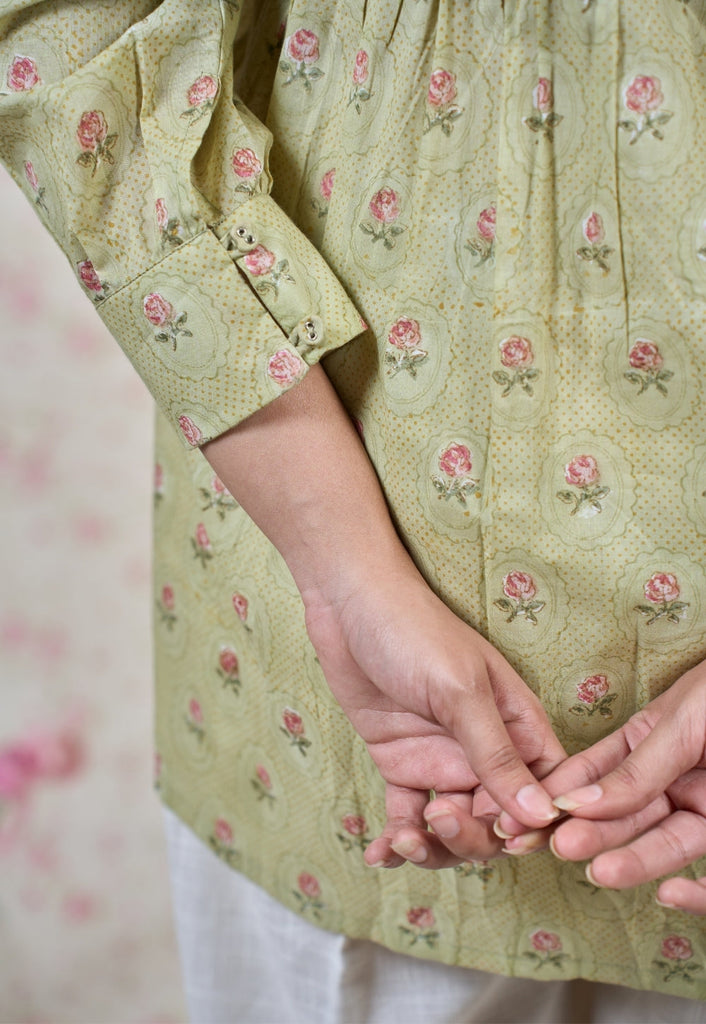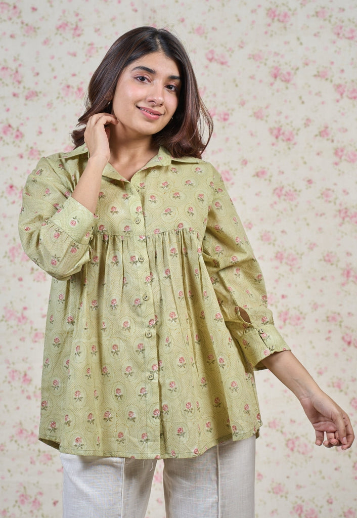 Light Green Sanganeri Handblock Printed Mul Cotton Straight Short Top.