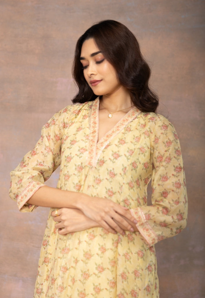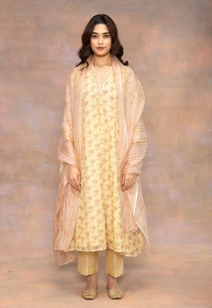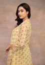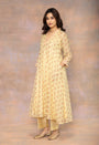 Yellow Sanganeri Handblock Printed Chanderi Silk Kali Kurta with Mul Lining.